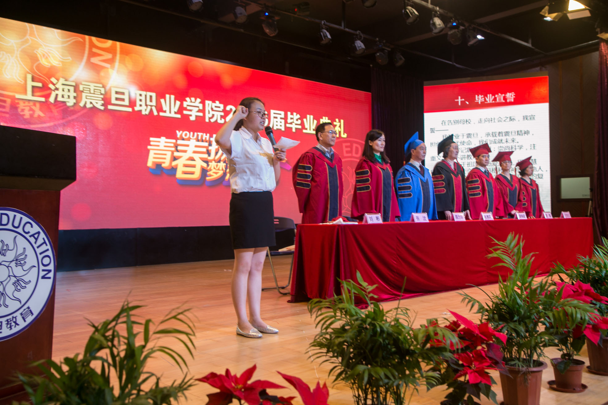 授证仪式后,在马丽娜同学的领誓下,全体毕业生们集体宣誓:“牢记震旦校训:崇尚科学,注重文艺,不讲教理。忠于祖国、热爱人民、用聪慧和才智奉献社会,以品格和精神影响他人,实现成才报国的梦想,实现中华民族的伟大复兴。”宣誓后,热情高涨的毕业生在陈院长的带领下高唱《毕业歌》,2016届毕业典礼在