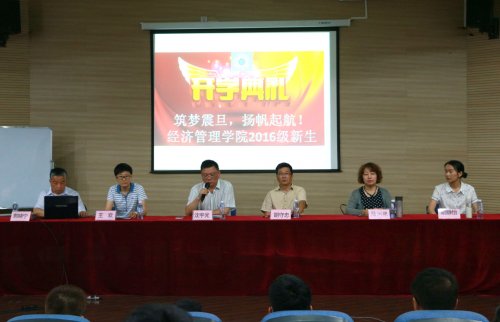 2016年9月13日下午,经济管理学院在震旦学院体艺楼实验剧场举行2016级新生开学典礼。胡守忠院长、各专业主任、全体教师、辅导员同2016级新生参加开学典礼。学院党总支副书记沈宇光老师主持会议。
