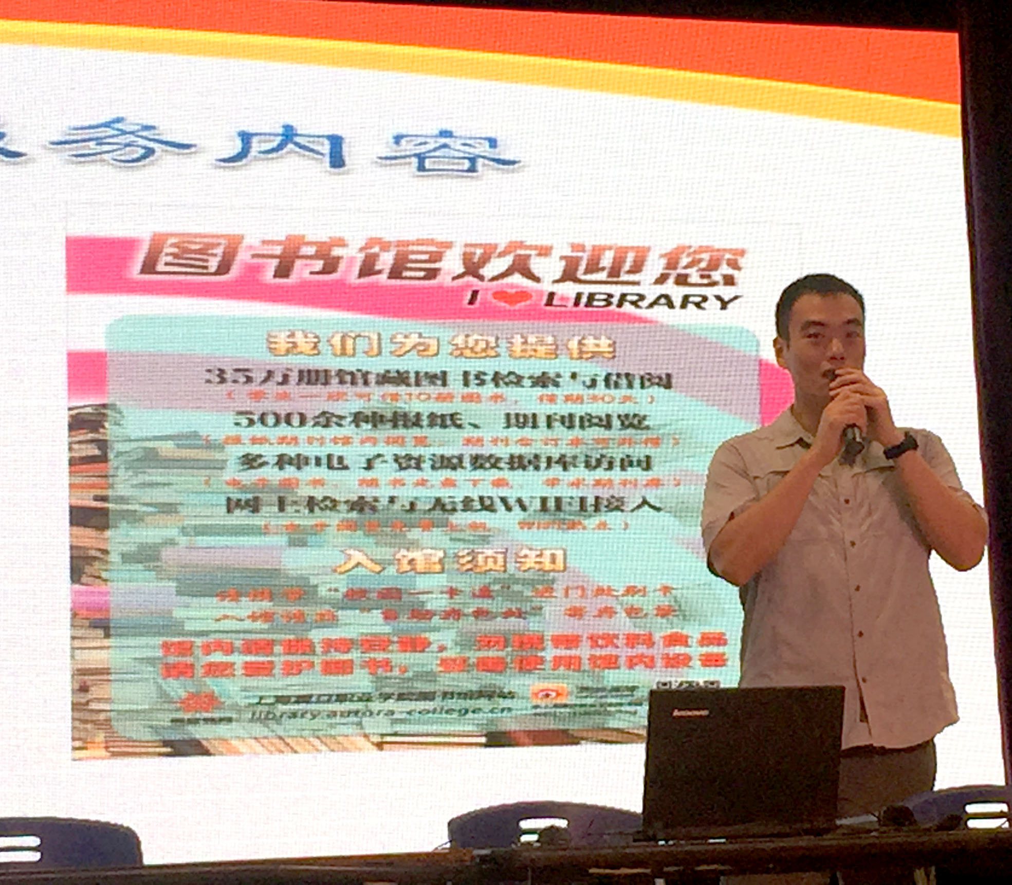 再次,学院图书馆李斯聪老师为全体新生介绍了图书馆为师生们服务的内容,例如:图书馆的地点、开放时间、服务内容、入馆须知、借还书须知以及网上查阅的方式等,并介绍了在学院官网上查阅各类书籍和资料的方法。