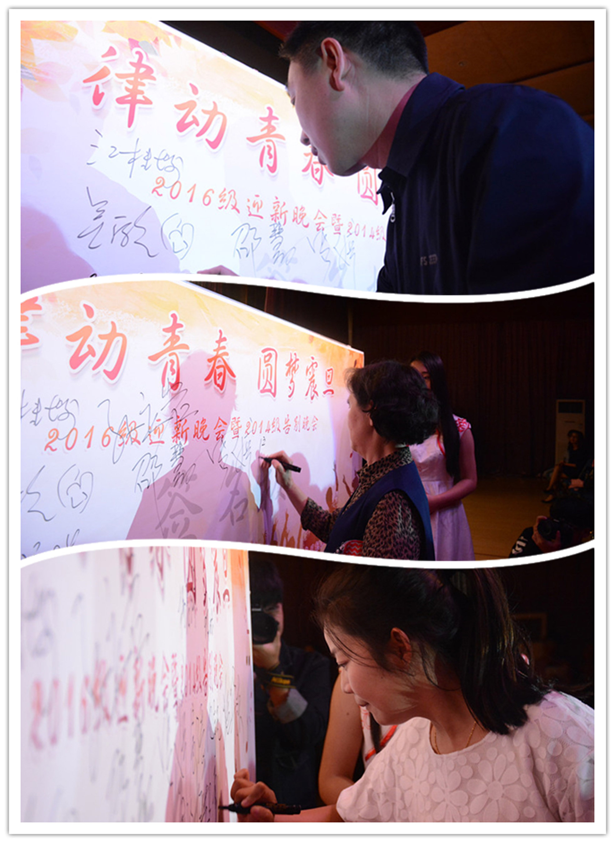 同学们对晚会热情满满,6点正式入场后不久,大礼堂已是座无虚席。18时30分,大礼堂灯光骤暗,六位青春靓丽的主持人携手闪亮登场。传统的红毯仪式,在追光灯的照耀下拉开了本次晚会的帷幕。出席本次活动的学院老师与团委学生会各部门部长们,在同学们热情的呼声中一一亮相,缓步走过红毯,于大舞台前的签字版上签名留念。