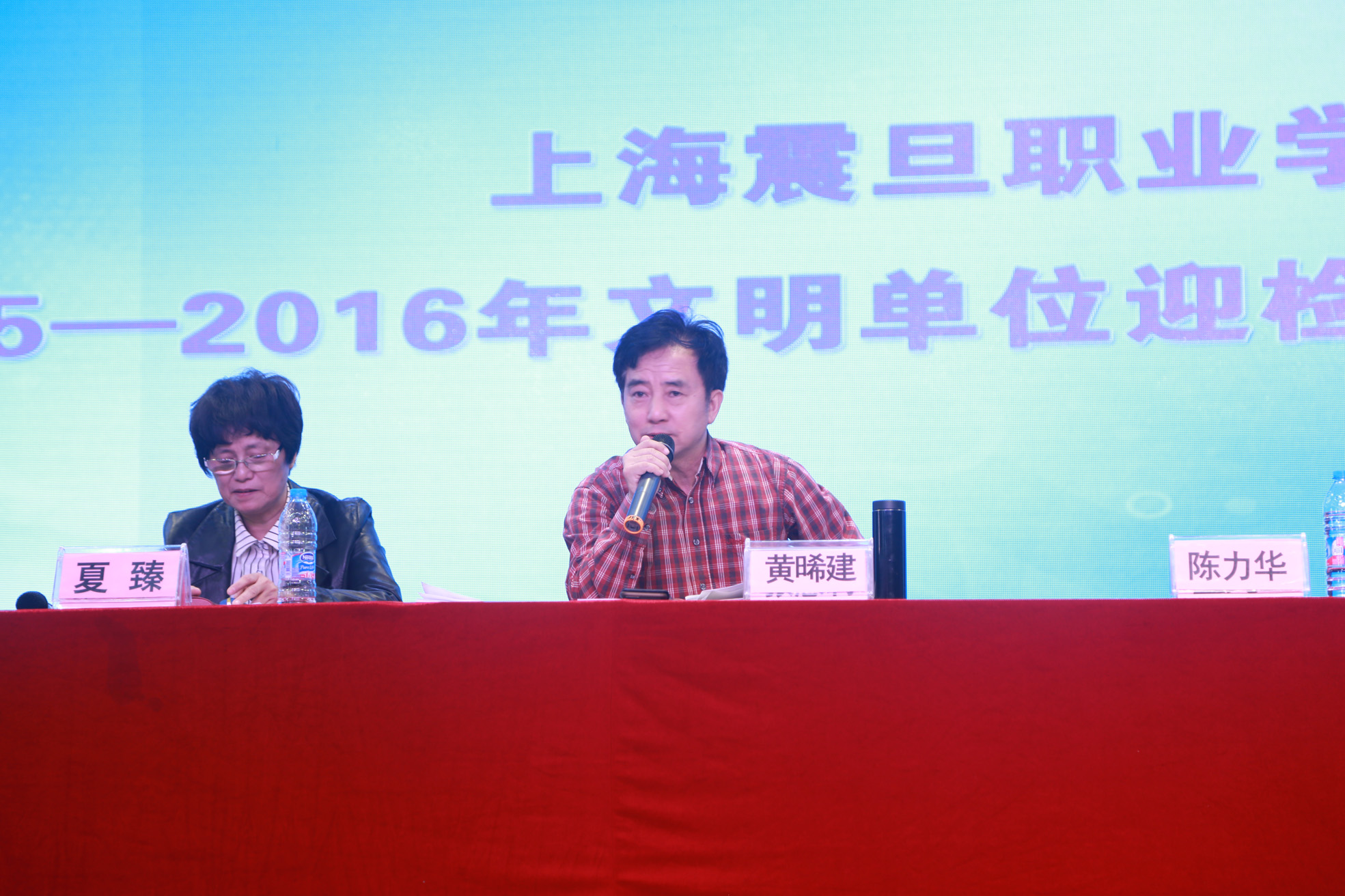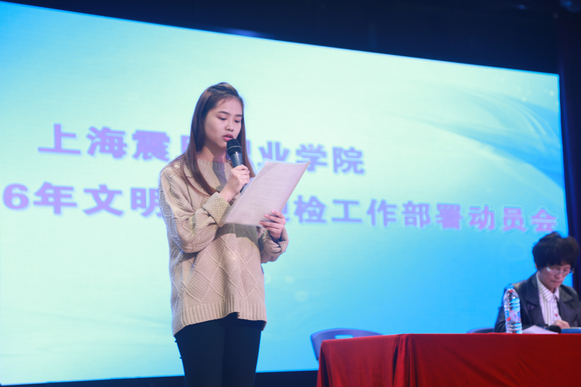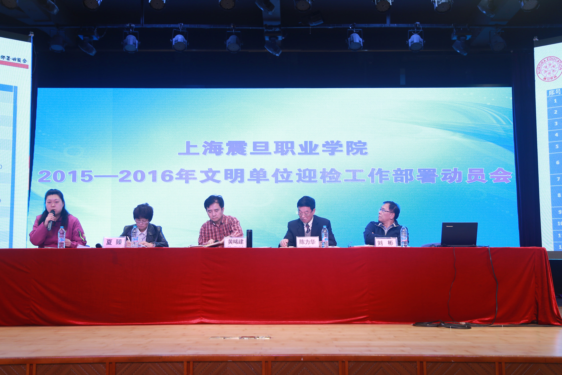 2016年11月4日,学院召开创建2015~2016年度市级文明单位迎评部署动员大会。震旦教育发展基金会理事长张惠莉、震旦教育集团董事长张沈;震旦学院党委书记黄晞建、院长陈力华、党委副书记夏臻、副院长刘彬等院领导同全校专任教师、辅导员、机关及后勤管理人员以及学生干部和学生代表等共同参加了动员大会。黄晞建书记主持大会。