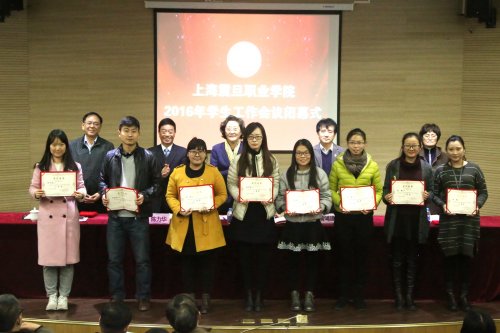 在2016年上海震旦职业学院学生工作闭幕式上,校领导为获奖人员授奖。