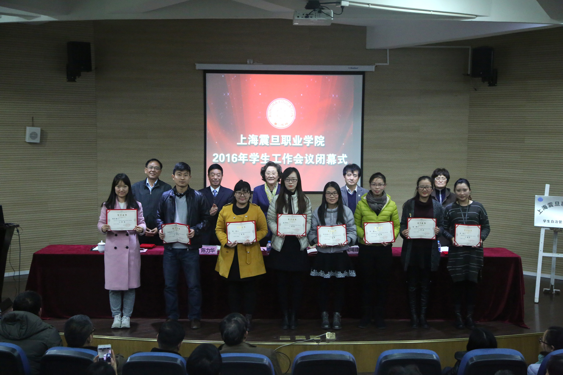 时值全国思想政治工作会议顺利召开之际,12月9日下午,我校2016年学生工作会议在体艺楼报告厅顺利闭幕。会议由上海震旦职业学院院长陈力华主持,震旦教育集团管委会主任张惠莉、党委书记黄晞建、副书记夏臻、副院长刘彬等出席了闭幕式。参加闭幕式的还有全体教职员工和部分学生代表。