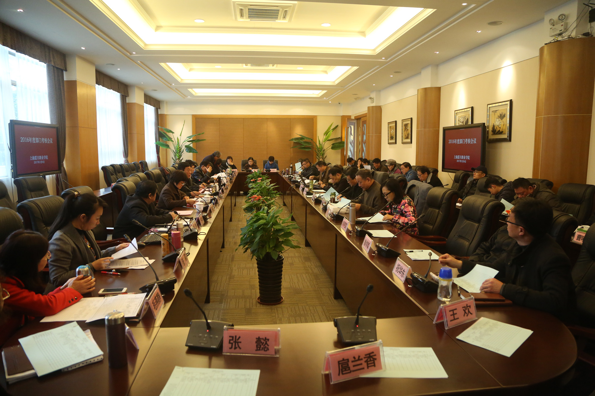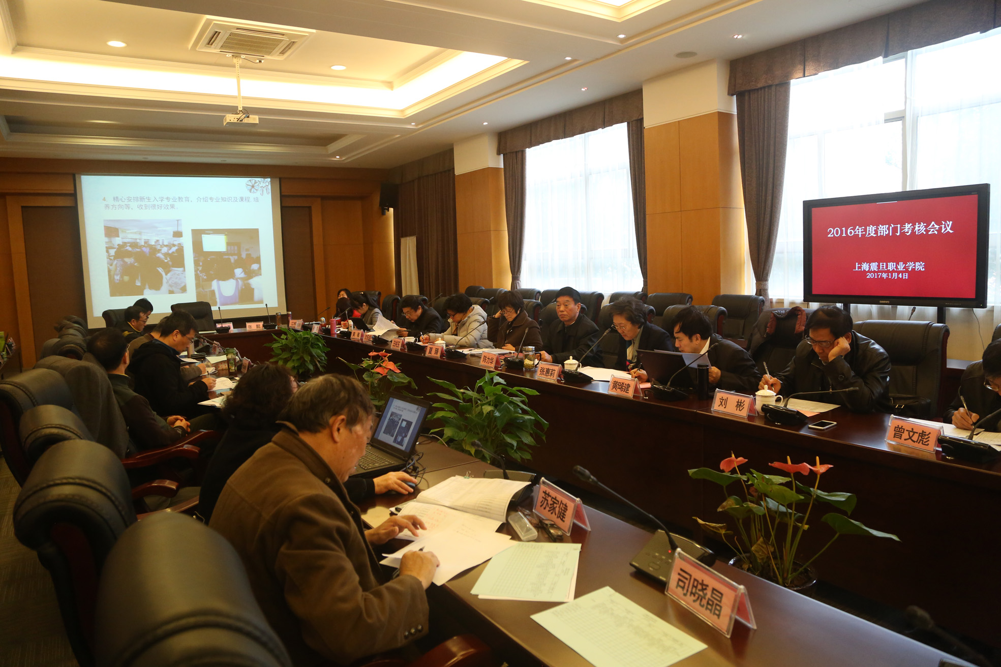 2017年1月4日,震旦学院举行2016年度部门考核会议。震旦教育发展基金会理事长张惠莉、震旦学院院长陈力华、学院党委书记黄晞建、副书记夏臻、学院副院长王纯玉、刘彬同学院全体中层干部参加会议。陈力华院长主持了上午二级分院的考核会议;黄晞建书记主持了下午管理部门的考核会议。