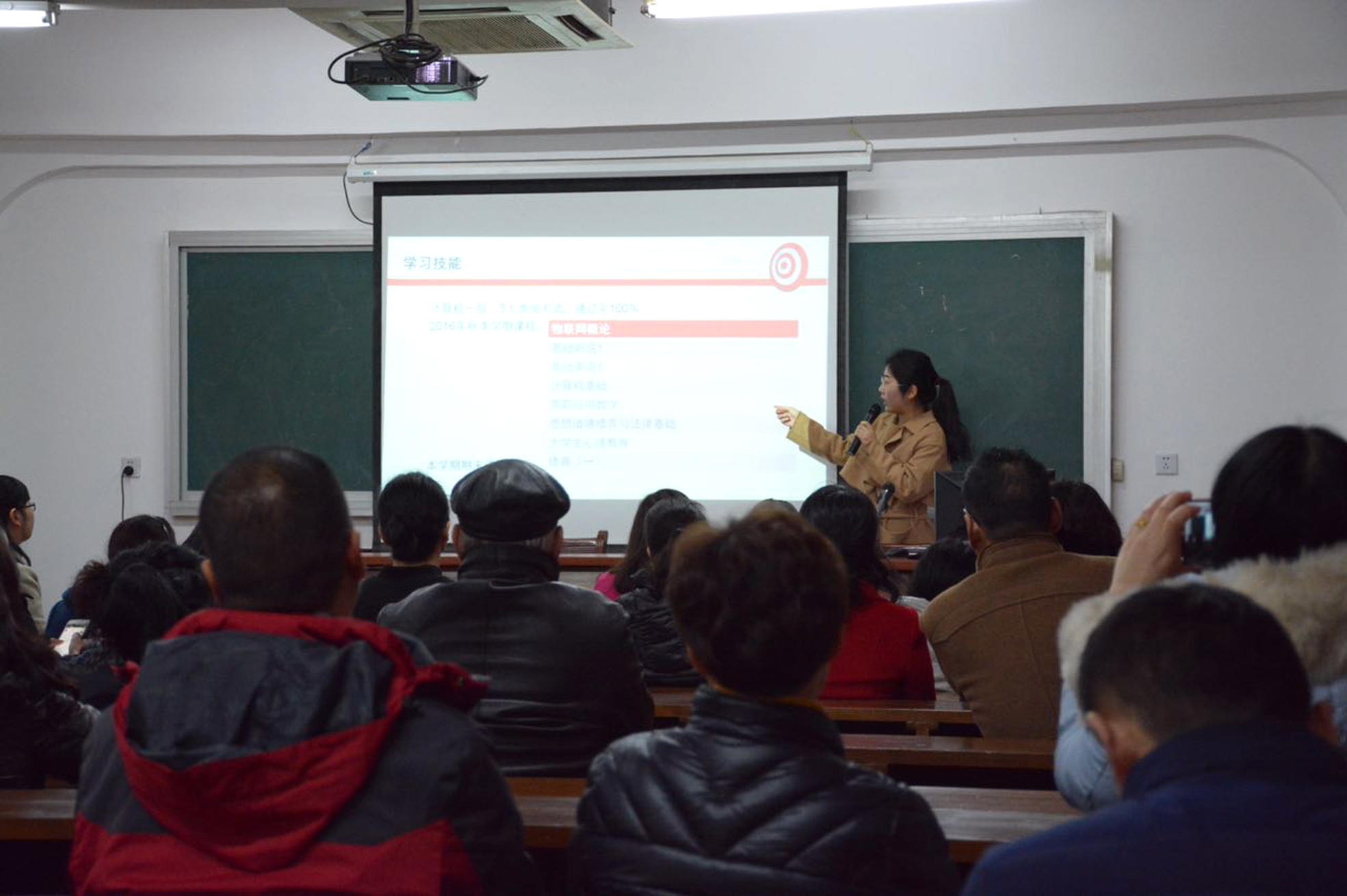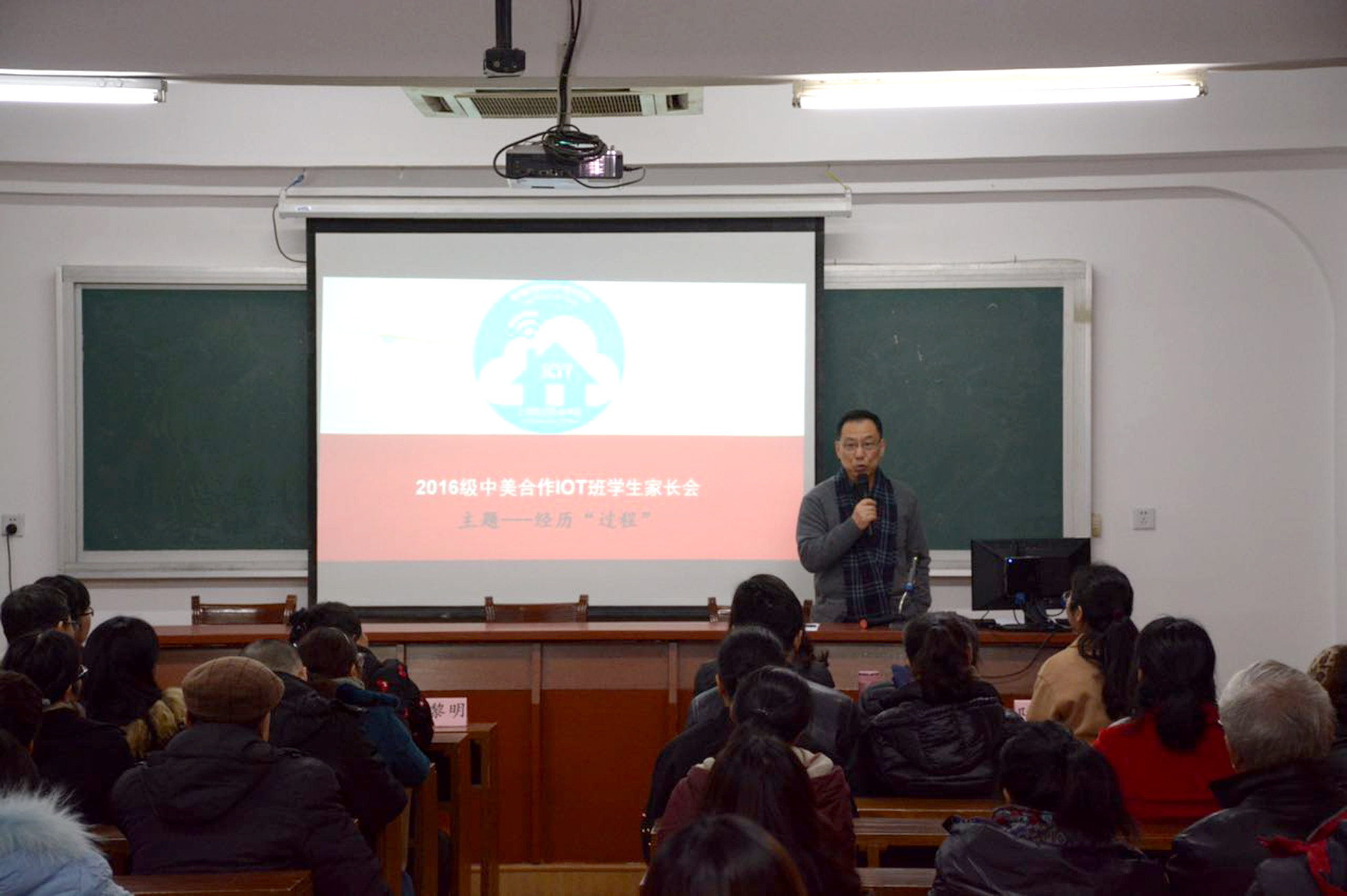 陆晶老师介绍了物联网专业学生在校期间学习生活的基本情况、班徽的含义和班级微信公众号的运营情况,并分析了本学期学生期末成绩以及各科学习情况;最后介绍本专业美国合作的学校加州浸会大学及后期赴美游学、留学准备工作。