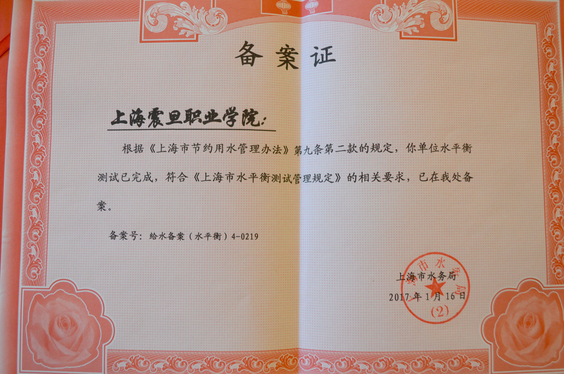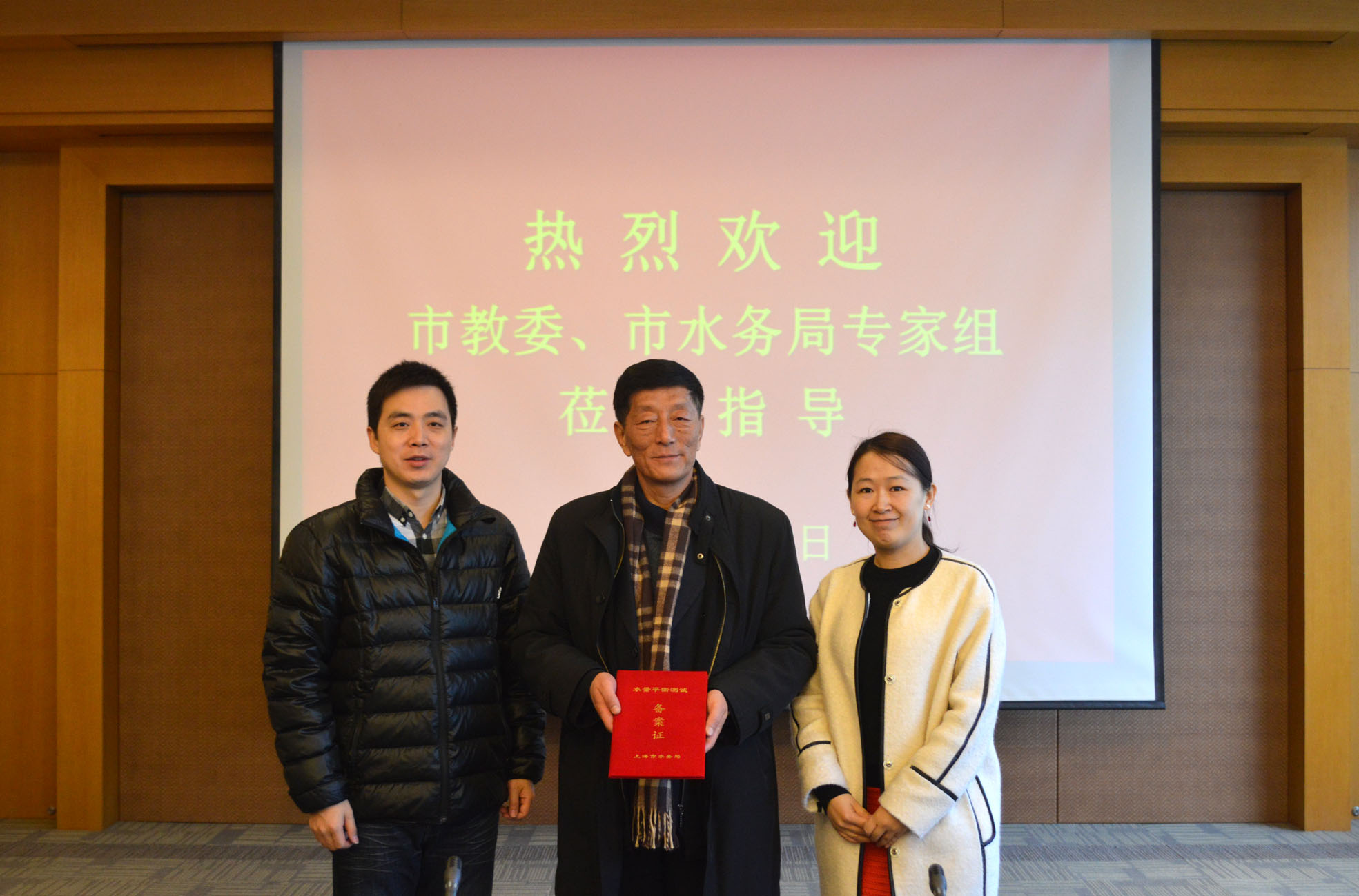 上海市水务局对我院在创建节水型校区活动中的水平衡测试工作给予肯定,并当场向我院颁发《水平衡测试达标备案证》。