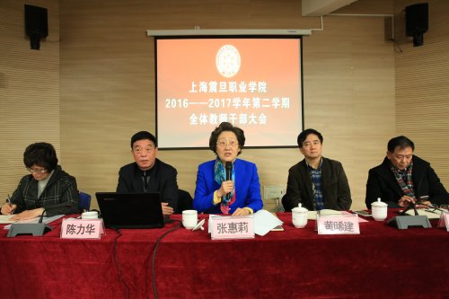2月24日上午,上海震旦职业学院2016-2017学年第二学期全体教师干部大会在学院小礼堂召开。会上黄晞建书记传达了2017年春季上海高校党政领导干部会议精神;陈力华院长做了《团结奋进,再创新高》的报告,并传达了翁铁慧副市长与教委主任苏明的讲话的主要内容,布置学院2017年的行政教学工作。最后张惠莉理事长做了鼓舞人心的讲话,她谈到了学院“双创”机制的建立,大学的价值、学院的发展前景和教师的素养等问题。