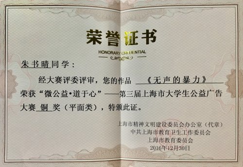 第三届“微公益,道于心”上海市大学生公益广告大赛从2016年3月开始,历时数月,到12月份圆满结束,这次活动在各高校开展的如火如荼。最终120幅作品从2000多份作品中脱颖而出。我传媒艺术学院14级广告设计与制作专业朱书晴同学以“远离暴力”为主题思想,精心创作设计的《无声的暴力》公益海报,在此次大赛中荣获铜奖。 (撰稿 传媒艺术学院)