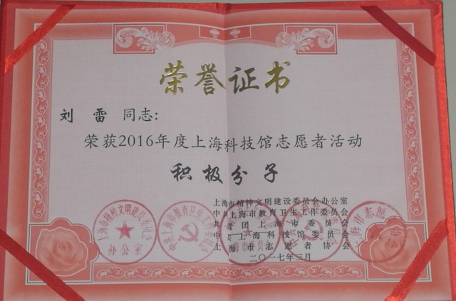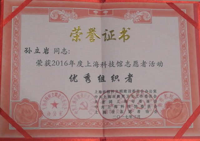 表彰会上,我校被授予“2016年度上海科技馆志愿者活动表扬集体”。我校孙立岩老师被授予“2016年度上海科技馆志愿者活动优秀组织者”称号,社会实践部沈毅同学、刘雷同学被授予“2016年度上海科技馆志愿者活动积极分子”称号。