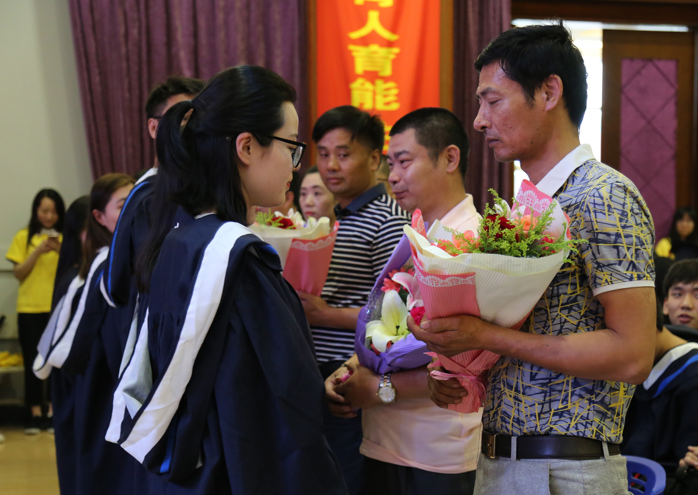 优秀毕业生给家长献花