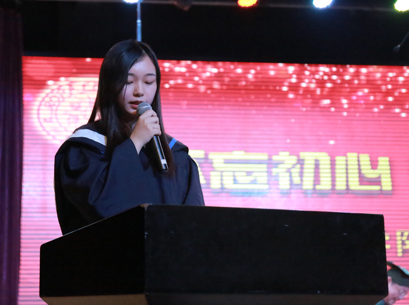 上海市优秀毕业生、预备党员朱书晴同学代表2017届毕业生代表发言。她首先分享了自己学习、实习、考取专升本的经历,并感恩学校的教育、感恩老师们的辛勤付出和体贴入微的关心指导,感恩父母的细致无私的爱和默默支持,感恩母校为学生提供成长的舞台。