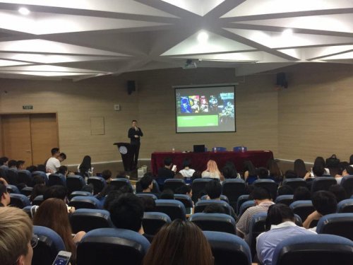 博思中国上海龙之谷数码有限公司校企合作总监王恺,为同学们介绍博思中国上海龙之谷数码公司的情况,博思中国公司从事游戏研发、服务外包及人才培训的综合集团公司。上海龙之谷数码科技有限公司与多家著名游戏公司是合作伙伴关系,资源很丰富,同学们对演讲反映很热烈。