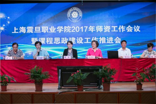 7月3日,上海震旦职业学院2017年师资工作会议暨课程思政建设工作推进会在校大礼堂隆重举行,震旦教育集团创始人、震旦教育发展基金会理事长张惠莉,震旦教育集团、上海震旦职业学院董事长张沈,校长、党委副书记陈力华,党委书记黄晞建等党政领导及全体教职员工参加了大会。