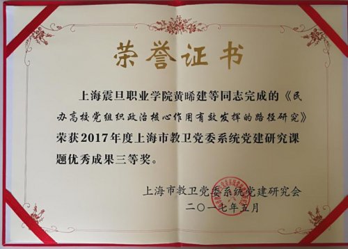 近日,上海市教卫党委系统党建研究会公布了《关于表彰党建研究课题优秀成果的决定》,由我校党委书记黄晞建主持,协同上海建桥学院、上海济光职业技术学院等民办高校,以及上海民办高校资深专家共同完成的《民办高校党组织政治核心作用有效发挥的路径研究》荣获2017年度上海市教卫党委系统党建研究课题优秀成果三等奖。