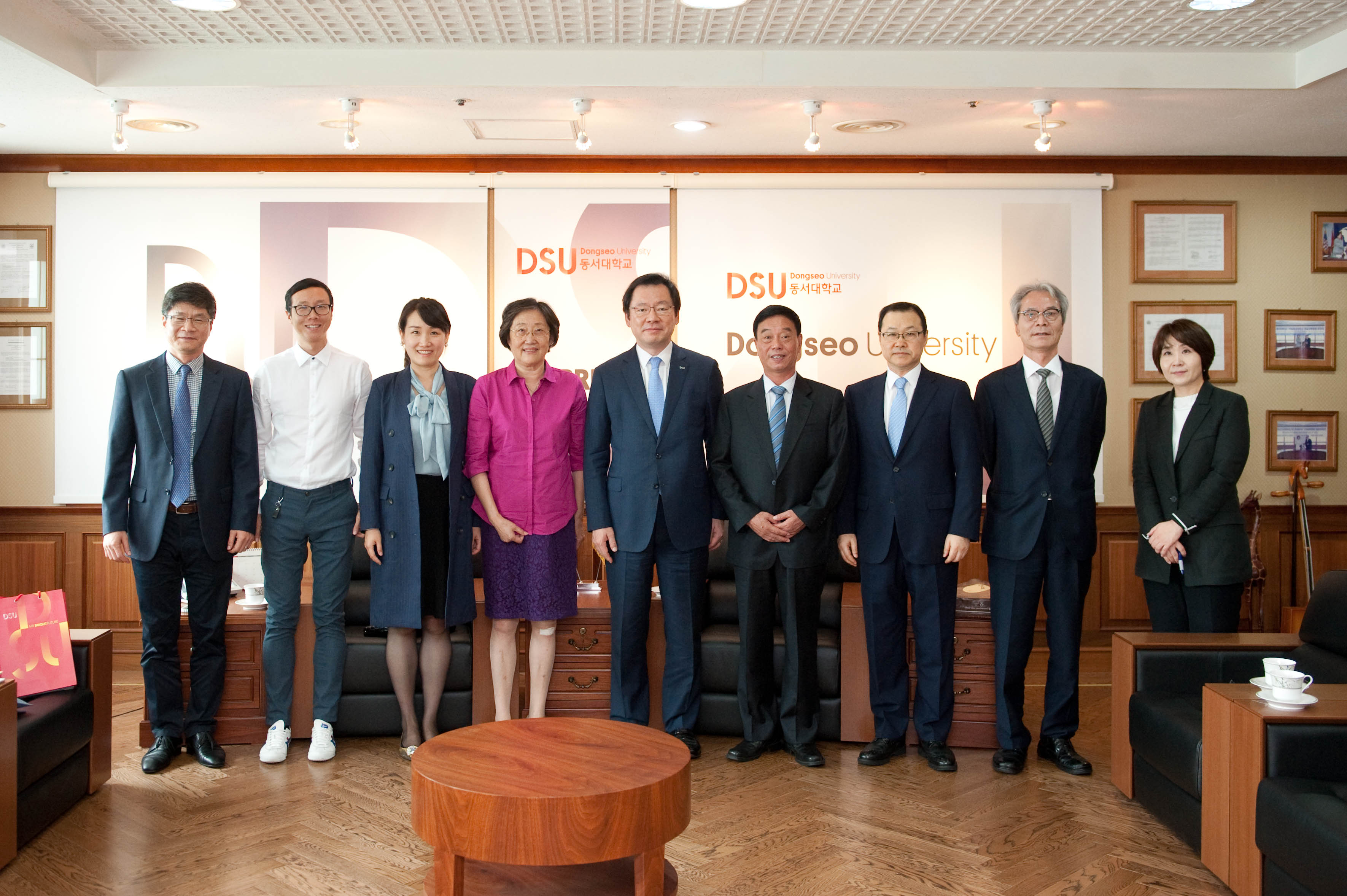 协议签订仪式当天,先播放了震旦与庆南大学的宣传视频,双方代表致辞后,陈力华校长与庆南情报大学总长秋万锡签订了两校合作协议书,张沈董事长代表震旦与秋万锡总长交换了礼物,并合影留念。