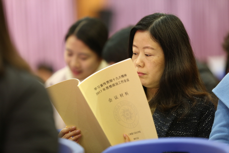 12月22日,我校在大礼堂隆重召开2017年思想政治工作会议。会议邀请民办高校党工委副书记王瑞杰莅临指导,震旦教育集团管委会主任张惠莉、董事长张沈、党委书记黄晞建、校长陈力华和党委副书记夏臻出席会议,各二级学院、行政部门负责人,全体教职工及学生代表参加会议。会议由陈力华校长主持。会议旨在学习宣传贯彻党的十九大精神,落实全国思政工作会议,激发广大教职员工自觉发挥潜在工作能力,进一步加强我校思政工作,把思政工作推上新台阶。