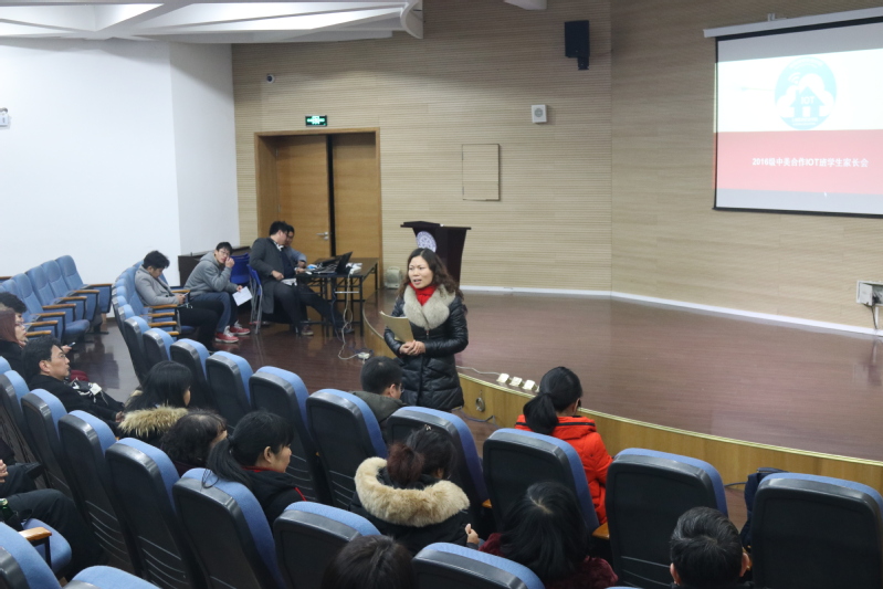 2018年1月11日下午四时,在校本部体艺楼报告厅,16、17级物联网应用技术(中美合作)班级召开本学期期末家长会,虽然天气寒冷,但是家长们如约而至。院长助理陈萍老师,专业主任袁明老师参加此次家长会,会议由辅导员陆晶老师主持。
