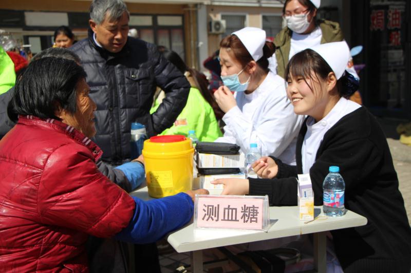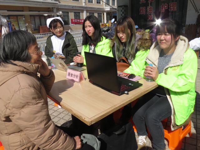 社区居民踊跃参与,在护理专业教师张伊倩,药学专业教师焦莹的指导下,同学们一下车就开始忙碌起来。在志愿者的引导下,护理专业同学量血压、测血糖;药学专业同学提供科学用药指导;营养专业同学利用科学软件为居民提供膳食分析;各项活动有条不紊地进行着。在面对社区居民的疑惑时,积极地给予解答,对高血压、糖尿病等老年常见疾病的预防和急救知识进行宣传,指导居民合理用药、健康饮食。