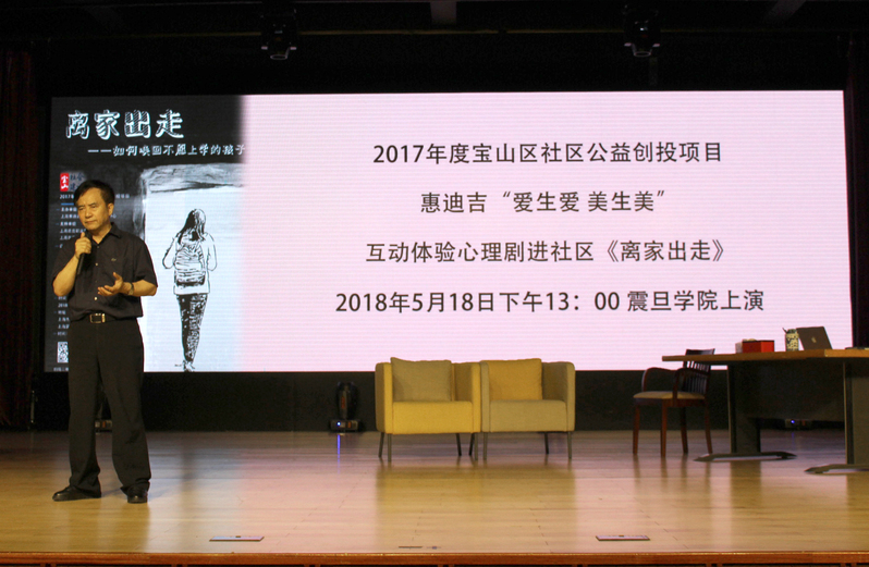 2018年5月18日下午13:00,由上海震旦职业学院学生处心理健康教育中心承办,上海惠迪吉公益人心理关爱中心主办,2017年度宝山区社区公益创投项目的互动体验心理剧《离家出走》在本部校区大礼堂完美落幕。上海市教育名师、震旦教育集团党委书记黄晞建教授进行了开场致词,黄书记讲道:“学习心理学可以强身健体提高免疫力,学会面对现实积极生活”。党委副书记夏臻,院办主任张莉,学生处处长毛燕静,资助中心主任梁霄及心理健康教育中心专兼职老师与来自六个二级学院的近300名震旦学院师生和附近居民观看了此次心理剧。