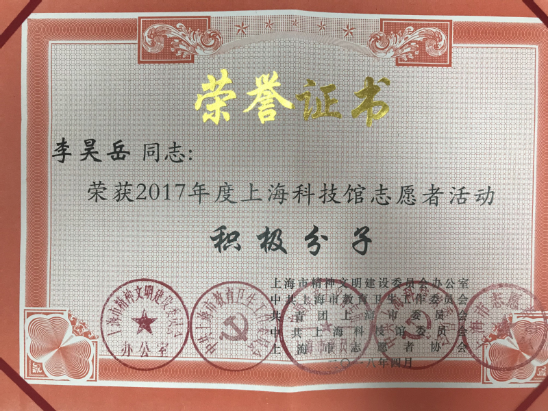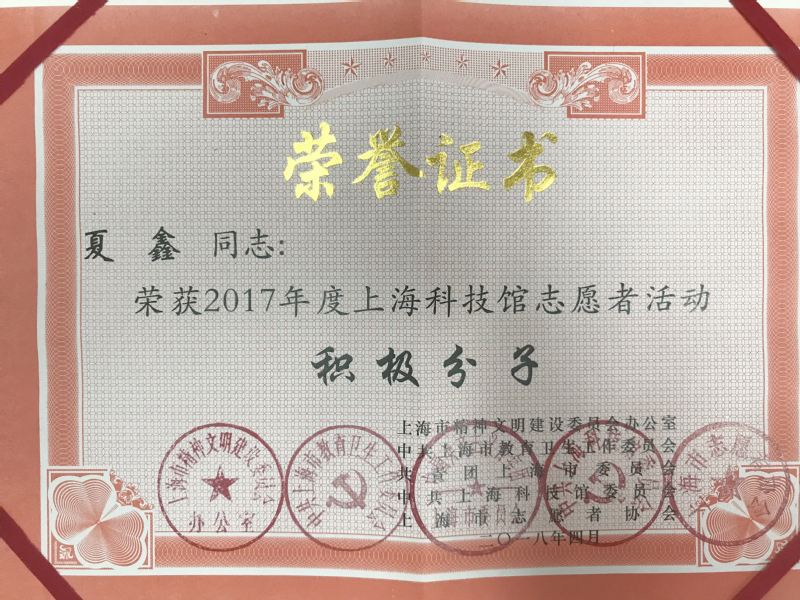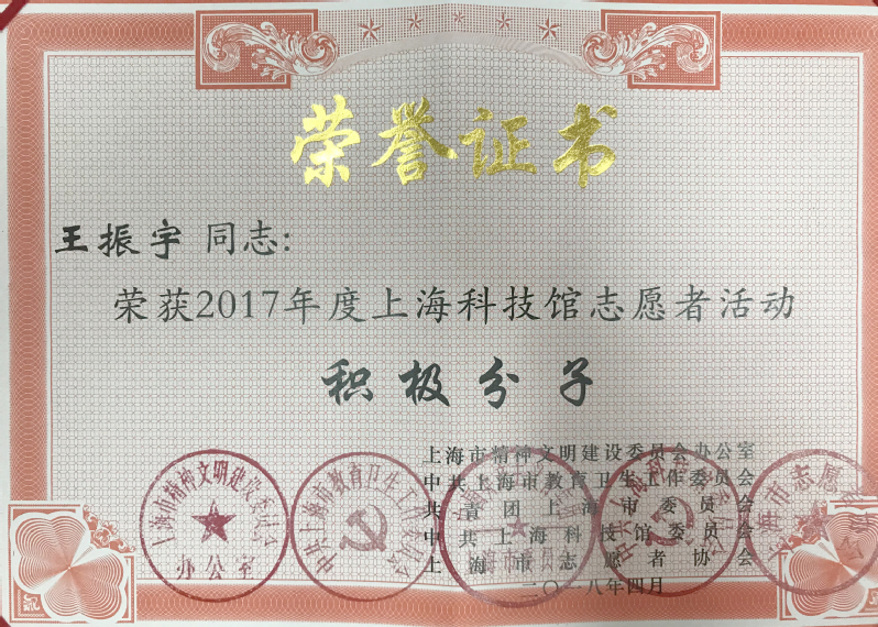 近日,“逐梦新时代 志愿新征程——2017年度上海科技馆志愿者表彰大会”在科技馆四楼会议大厅举行,市文明办领导、科技馆领导、团市委领导、高校领导、市民志愿者及高校志愿者代表400余人出席了本次大会。表彰会上,我校青年志愿者总队被授予“2017年度上海科技馆志愿者活动先进集体”。我校喻璐老师被授予“2017年度上海科技馆志愿者活动优秀组织者”称号,社会实践部李昊岳、夏鑫、王振宇同学被授予“2017年度上海科技馆志愿者活动积极分子”称号。