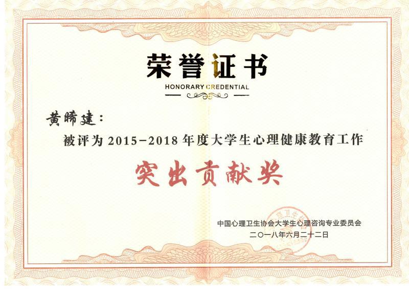 2018年6月20-22日在吉林大学举行的第十三届全国大学生心理健康教育与咨询学术交流会上,我校党委书记黄晞建教授,因其多年来对大学生心理健康教育做出的杰出贡献,被中国心理卫生协会大学生心理咨询专业委员会评为“突出贡献奖”!据悉,这次大会共授予大学生心理健康教育工作突出贡献奖8人,黄晞建教授是唯一来自民办高校的获得者。