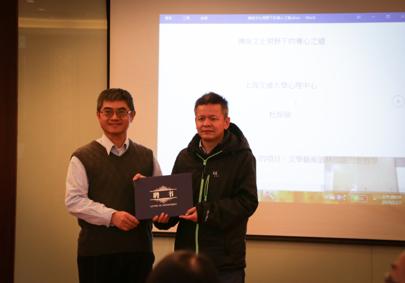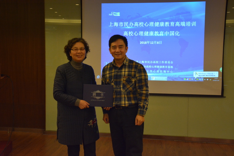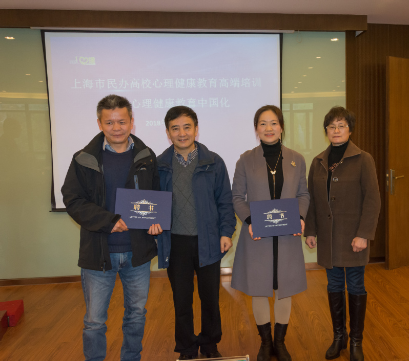 上海震旦职业学院黄晞建书记和夏臻副书记为上海交通大学心理咨询中心杨文圣主任和汪国琴副主任颁发聘书。