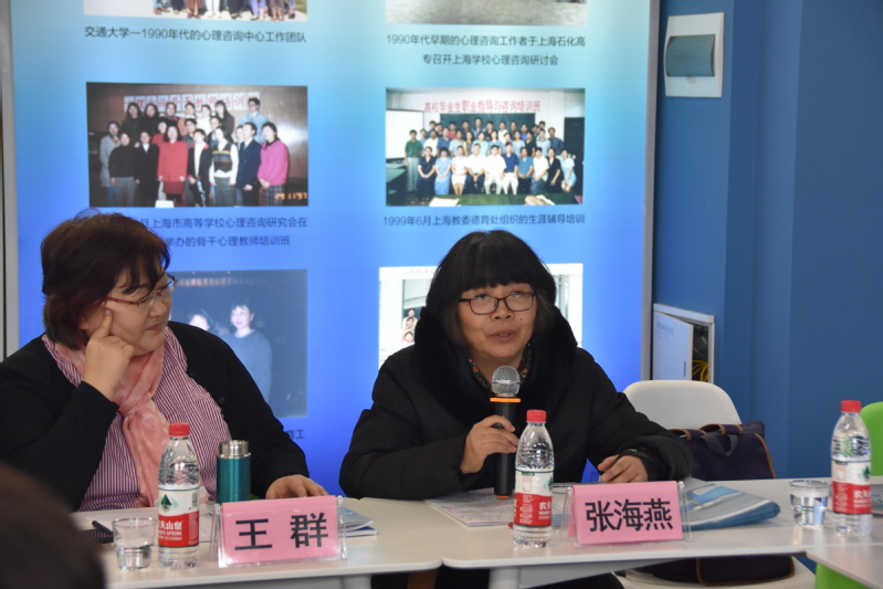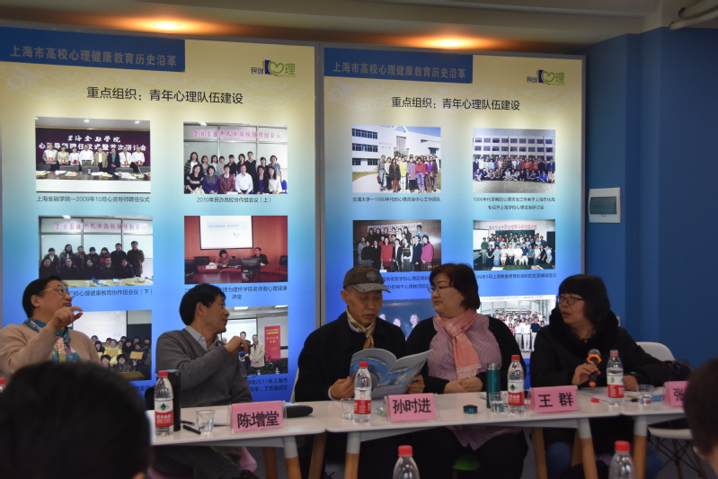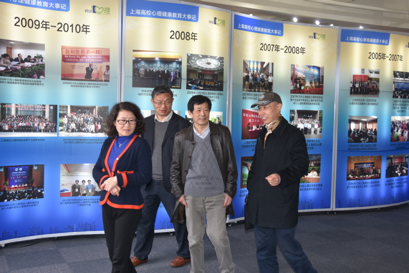 在高校心理咨询协会会长陈增堂的陪伴下,专家们参观了“基地”实训中心。会长陈增堂向各位高校的心理学专家详细讲述了上海高校心理健康教育的30年发展历史。