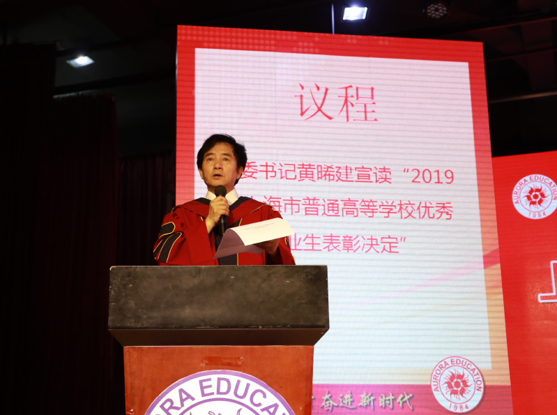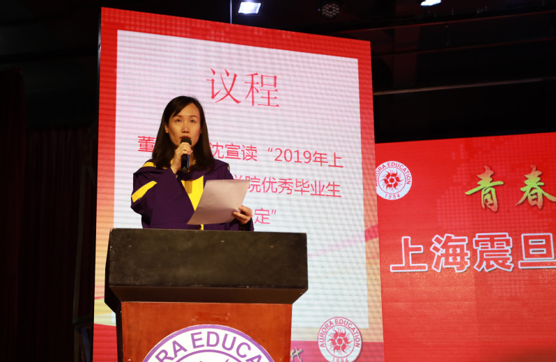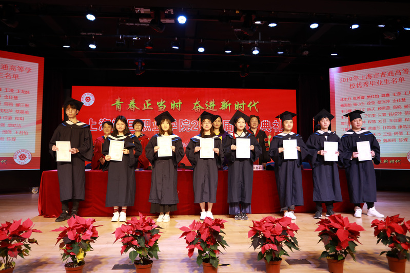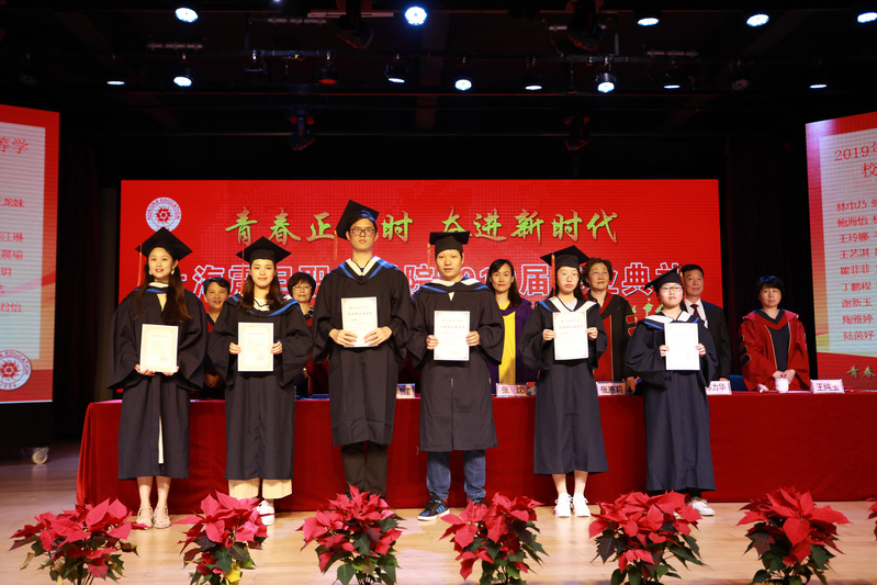 典礼在庄严的国歌声中展开序幕。首先黄晞建书记宣读《2019年上海市普通高等学校优秀毕业生表彰决定》;董事长张沈宣读《2019年上海震旦职业学院优秀毕业生表彰决定》;党委副书记夏臻宣读了《2019届毕业生中考取全日制专升本学生名单》。表彰决定宣读完毕,上海市高校优秀毕业生以及校级优秀毕业生依次上台领取荣誉证书并合影。