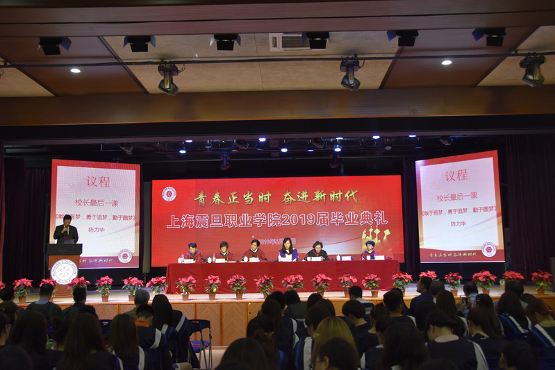 2019年6月17日上午,上海震旦职业学院 “青春正当时,奋进新时代” 2019届毕业典礼在大礼堂隆重举行。震旦教育创始人、震旦教育发展基金会理事长张惠莉、上海震旦教育集团董事长张沈、党委书记黄晞建、校长陈力华、党委副书记夏臻、副校长王纯玉、副校长张雅丽出席了此次典礼。各二级学院院长、党总支书记、教师代表、全体辅导员、优秀毕业生家长代表以及2019届毕业生共同参与此次典礼。典礼由学生处处长毛燕静主持。