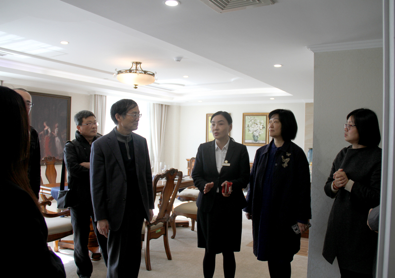 会后,在党总支书记徐霞、酒店管理专业实验教学中心主任董伟玲的陪同下,考察组参观了酒店运营研究中心、酒文化实验教学中心、客房实验教学中心、茶文化实验教学中心、智慧套房等实训中心。徐老师介绍,酒店专业的理论教学和实训融为一体,实践教学贯穿始终。参观中考察组对实训基地赞不绝口。