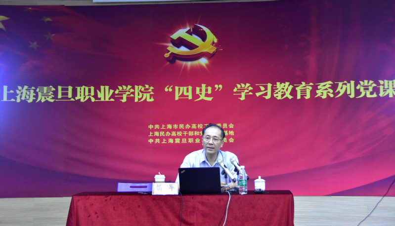 2020年7月10日下午13:00,上海震旦职业学院“四史”学习教育系列党课在学校体艺楼小剧场开讲。此次党课邀请市“四史”宣讲团专家、上海市社联副主席、上海市中共党史学会会长忻平教授作《纪念上海解放七十周年》专题讲座。本次专题学习由校党委书记黄晞建主持,校长冯伟国、副校长王纯玉等校领导以及全体党员同志、入党积极分子通过线下参与和线上观看直播的形式参加了党课学习。