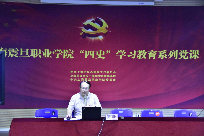 7月16日上午,上海震旦职业学院“四史”学习教育第六次专题党课在学院小剧场举行,上海外国语大学贤达经济人文学院党委书记、上海市教育委员会派驻民办高校督导专员、教育部教育信息化专家夏骄雄博士以《国家金融名片上的中国精神》为题向学院“四史”学习教育研修班和高级党校全体学员作专题报告。夏骄雄书记从国家金融名片——人民币的诞生讲起,讲述了人民币的历史发展过程,阐述了人民币的历史价值和历史功绩;进一步阐释了人民币体现的民族精神和时代精神。
