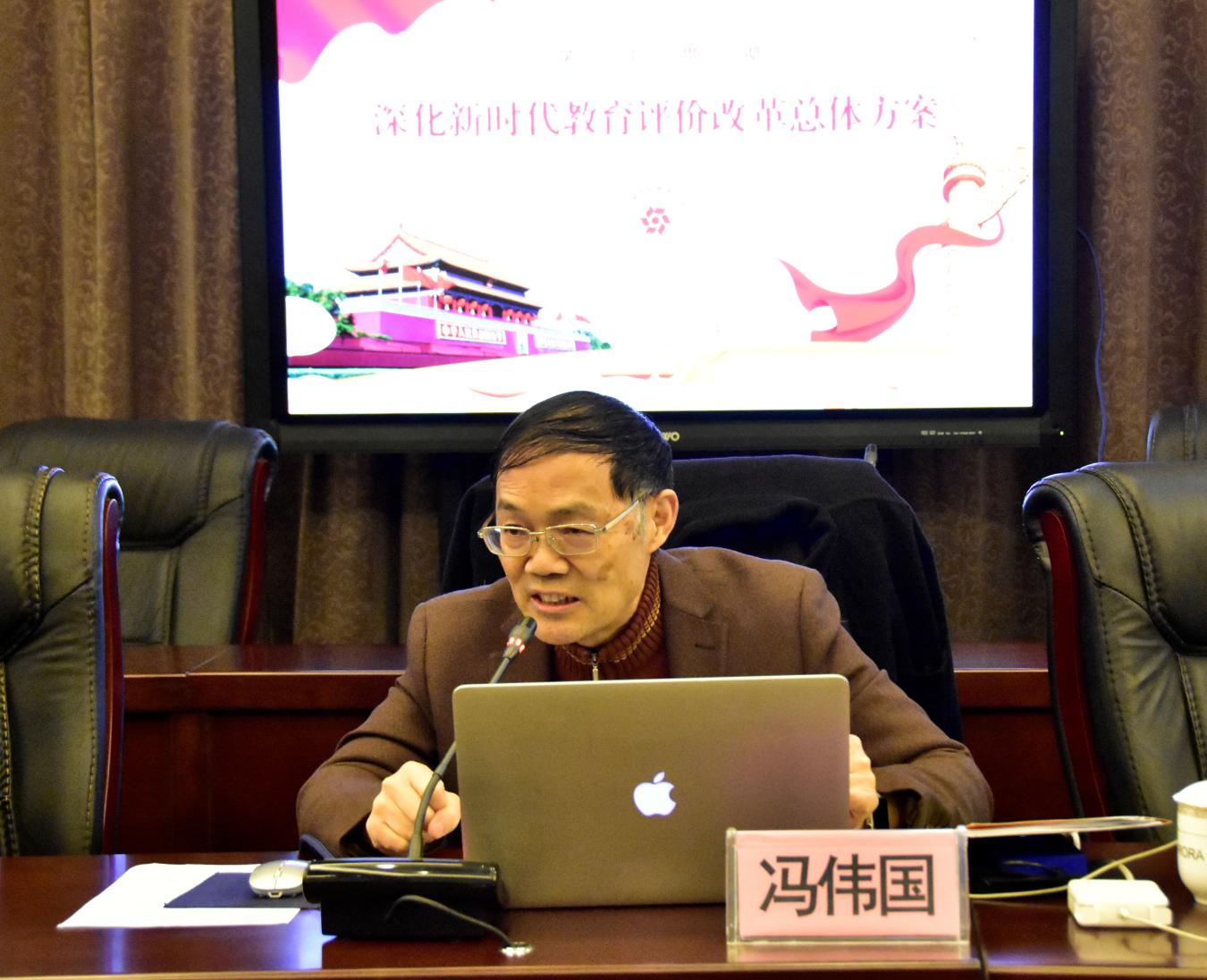 冯伟国校长传达了中共中央、国务院印发《深化新时代教育评价改革总体方案》精神,从《总体方案》总体要求、重点任务、组织实施三个方面介绍了主要内容。《总体方案》坚持以立德树人为主线,以破“五唯”为导向,以五类主体为抓手。全体中层干部要以新时代中国特色社会主义思想为指导,切实学习贯彻《总体方案》精神。各部门、二级学院要认真展开讨论,推进教育评价改革。