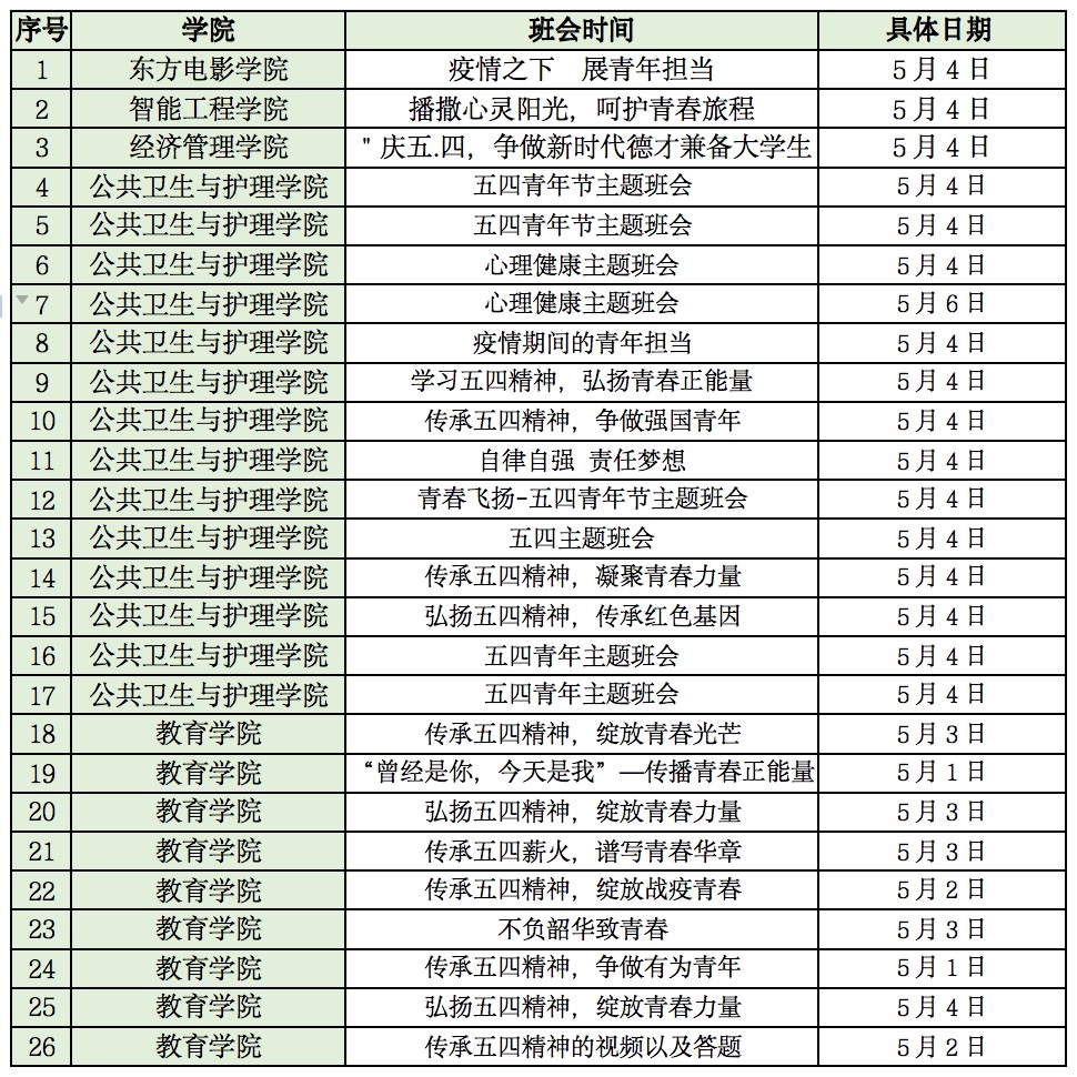 五四青年节,我校各二级学院在学生处组织下,发挥专业所长,从不同方面组织策划多场主题班会,让莘莘学子感受五四精神的正能量。