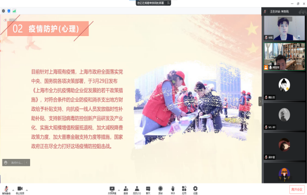 最后,辅导员徐凯老师与同学们进行了交流,了解近期同学们的日常生活和学习情况,并鼓励同学们要将积极健康的心理贯穿到思想、学习以及生活的方方面面,正确地认识自己、控制自己,寻找适合自己的调节方式,例如课余居家健身打卡、无聊时和朋友视频通话等等,以积极乐观的心态迎接每一天。