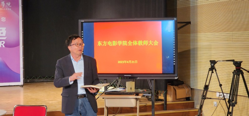 2023年4月21日下午,东方电影学院在2号教学楼新闻演播厅召开了全体教师大会,安排部署近期工作。院长郜明教授主持会议,各专业主任、实训室主任、教学秘书、辅导员、专兼职教师、实训员参加了会议。