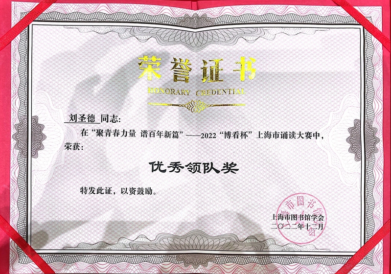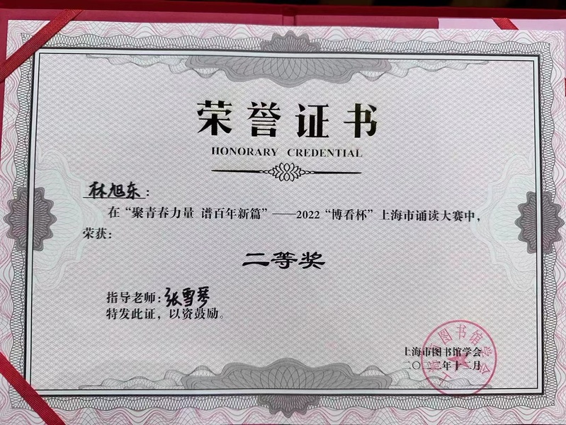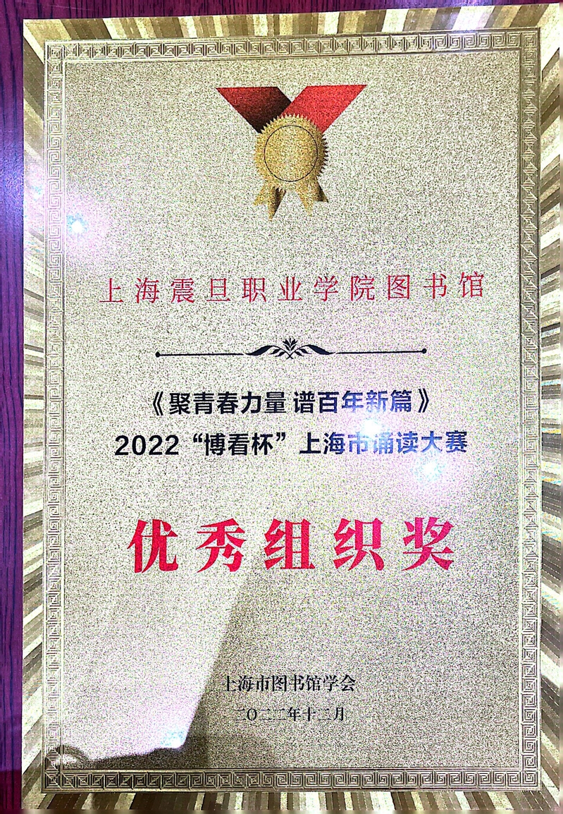 5月16日,《聚青春力量 谱百年新篇》2022“博看杯”上海市诵读大赛决赛在上海图书馆东馆乐享厅落下帷幕,我校参赛作品《丰碑》在决赛中荣获二等奖,上海震旦职业学院获“优秀组织奖”,我校图书馆刘圣德老师获“优秀领队奖”,校团委张雪琴老师获“优秀指导老师奖”。