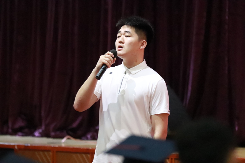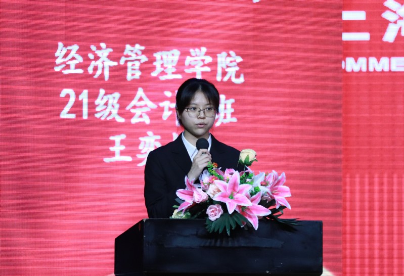 经济管理学院21会计2班王奕楠同学代表在校生发言。她说,作为学弟学妹,我们会时刻以学姐学长为榜样,以奋斗的姿态激扬青春,不负时代,不负华年;以勇敢的状态展现青春,踔厉奋发,笃行不怠;以包容的心态拥抱青春,求真务实,追求卓越。祝愿2023届的学姐学长们前程似锦,一帆风顺。