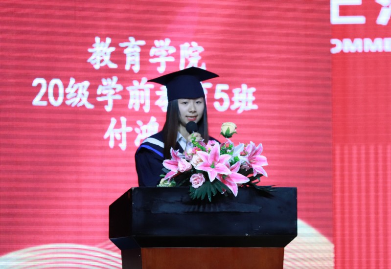 教育学院20学前5班的付鸿雁同学代表2023届毕业生发言。她表示将不忘“崇尚科学、注重文艺、不讲教理”的校训及“以人为本、育人育能、德育为先、教会做人”的教育理念,带着母校的期望、老师的教诲、朋友的鼓励,砥砺前行,做个怀揣梦想脚踏实地的人,以青春之名,赴时代之约。