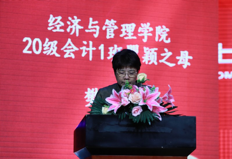 20会计1班毕业生瞿颖的母亲樊静文女士作为毕业生家长代表发言。她向与会领导、老师和同学们表达了诚挚的问候与感谢,希望毕业生们在人生的道路上继续前行,成为有担当、有情怀的社会栋梁之才。