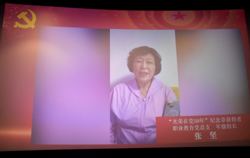 会上,职教部党总支在党50年的张坚老师通过视频,向在座的党员同志讲述了自己加入党组织50年来的经历与感悟。震旦职业学院党委书记黄晞建向张坚同志颁发了“光荣在党50年”纪念章,由职教部党总支书记钟劼菁代为领取。