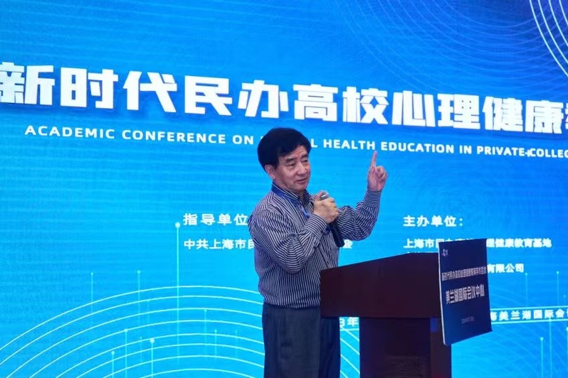 上海市民办高校党工委二级主任科员周光狼同志讲话。他提到,心理健康教育是高校人才培养体系的重要组成部分,也是高校思想政治工作的重要内容。民办高校要提高政治站位,坚持育心与育德相结合,培育担当民族复兴大任的时代新人,同时要加强保障措施,将民办高校心理健康教育落到实处。