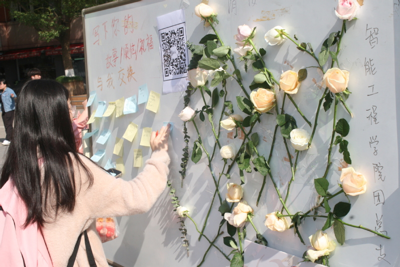 本次活动共分为四个板块:“请接受花与称赞”、“留下你想留的,带走你想带走的”、“晾晒诗歌”、“涂个开心”。在院学生会和14位学生志愿者共同组织下,整个活动有条不紊地展开,为广大师生提供了一个展现情感、分享心声的平台。